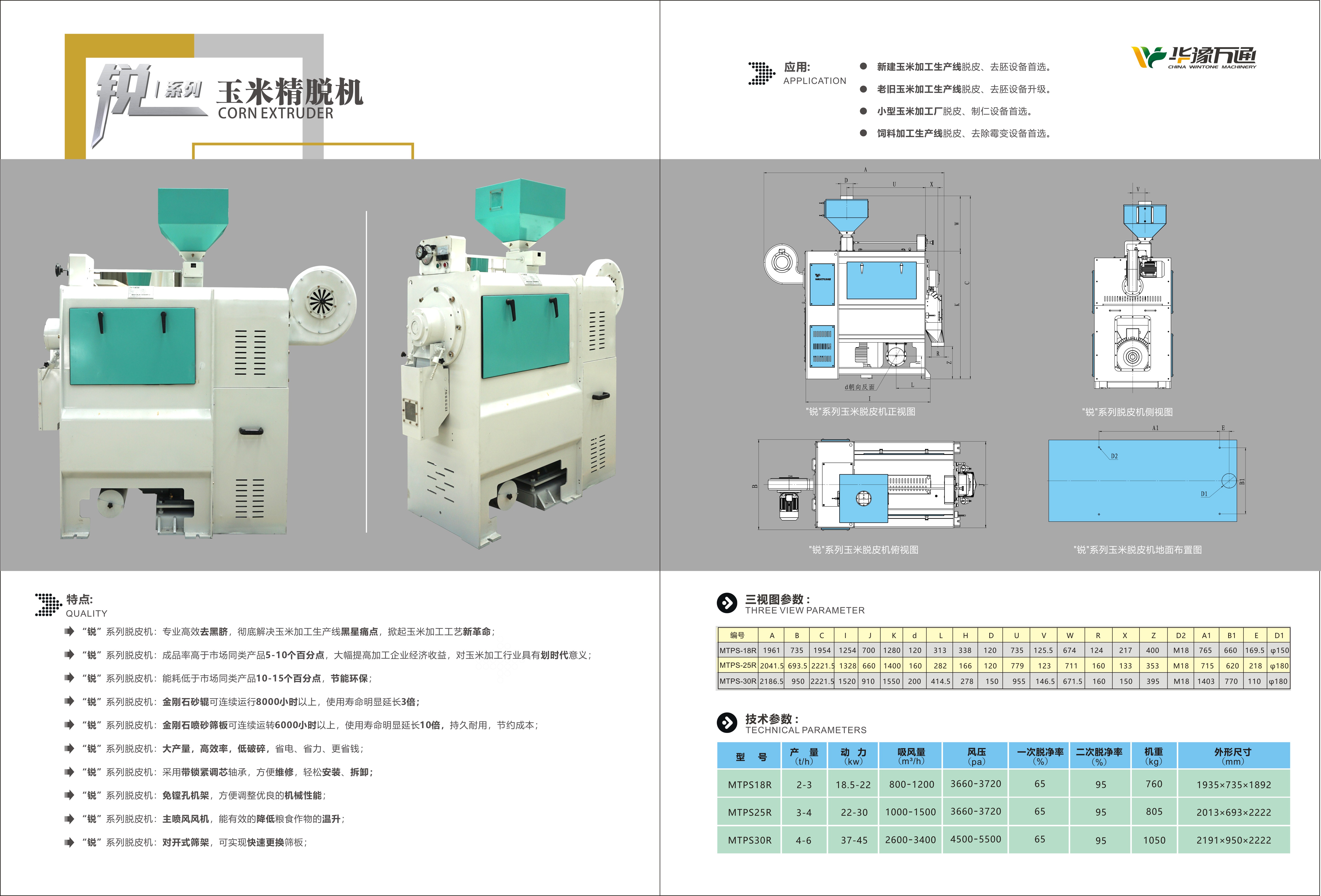 機器概述: 華豫萬通“銳‘系列脫皮機,摒棄傳統(tǒng)脫皮機“碾磨”的加工方式,采用“干式切削剝”技術,可實現對玉米胚乳的分層精細切削剝離及胚芽的一次性剝除,從而達到對脫皮物料的很小破碎率和很佳脫皮效果。一次脫凈率60%,二次脫凈率達95%以上。 同時,相對傳統(tǒng)脫皮機,同樣功率, 產量提升1.5-2倍,節(jié)能降耗,迅速提升玉米加工企業(yè)利潤點。同樣的產量比效果,同樣的效果比能耗。 機器應用: *新建玉米加工生產線脫皮、去胚設備。 *老舊玉米加工生產線脫皮、去胚設備升級。 *小型玉米加工廠脫皮、制仁設備。 *飼料加工生產線脫皮、去除霉變及粗纖維設備。 機器圖片及參數: 機器特點: “銳”系列脫皮機:專業(yè)高效去黑臍,解決玉米加工生產線黑星痛點,掀起玉米加工工藝新潮流; “銳”系列脫皮機:成品率高于市場同類產品5-10個百分點,大幅提高加工企業(yè)經濟收益,對玉米加工行業(yè)具有意義重大; “銳”系列脫皮機:能耗低于市場同類產品10-15個百分點,節(jié)能環(huán)保; “銳”系列脫皮機:金剛石砂輥可連續(xù)運行8000小時以上,使用壽命明顯延長3倍; “銳”系列脫皮機:金剛石噴砂篩板可連續(xù)運轉6000小時以上,使用壽命明顯延長10倍,持久耐用,節(jié)約成本;“銳”系列脫皮機:大產量,低破碎,省電、省力、更省錢; “銳”系列脫皮機:采用帶鎖緊調心軸承,方便維修,輕松安裝、拆卸; “銳”系列脫皮機:免鏜孔機架,方便調整出優(yōu)良的機械性能; “銳”系列脫皮機:主軸噴風風機,能有效的降低糧食作物的溫升; “銳”系列脫皮機:對開式篩架,可實現快速更換篩板; 產成品展示: 更多糧食加工設備:歡迎咨詢華豫萬通 :0371-86635901