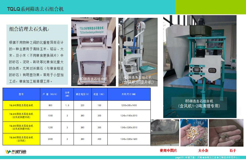 華豫萬通生產的TQLS系列組合清理去石機,該系列組合型清理去石機整合風機、振動篩、去石機為一體的糧食清理設備,常應用于糧食加工中清理去除大中小雜、石頭以及輕雜。其中TQLS-45型清理去石機常應用1噸下糧食清理,而TQLS-85組合清理去石機,精工制作常應用于30噸左右糧食加工生產線的前段清理工序。