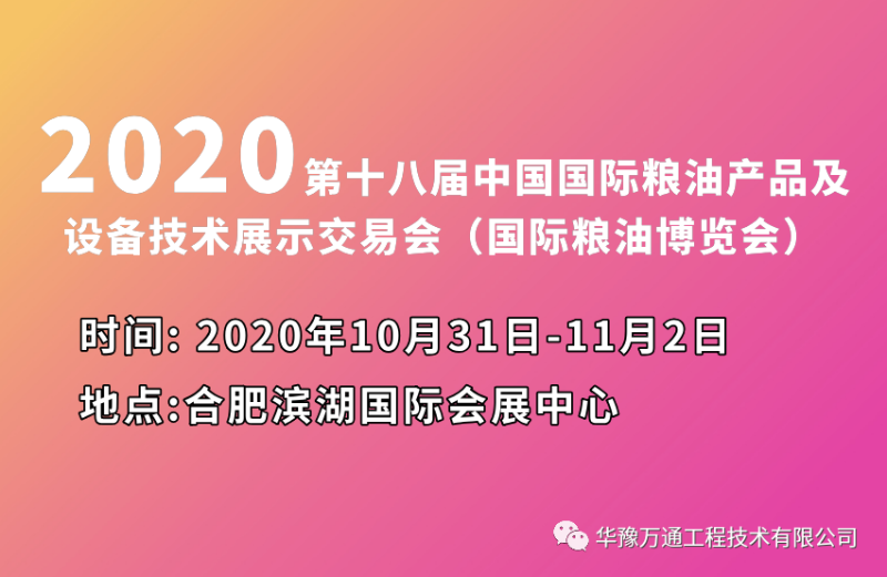 2020年10月31日,合肥濱湖國際會展中心,華豫萬通誠邀您蒞臨展位,了解華豫萬通新雜糧設備,探討雜糧加工工藝,共襄盛舉。華豫萬通作為糧機設備展區重點企業,本次將攜帶多款新研發設備亮相展會。