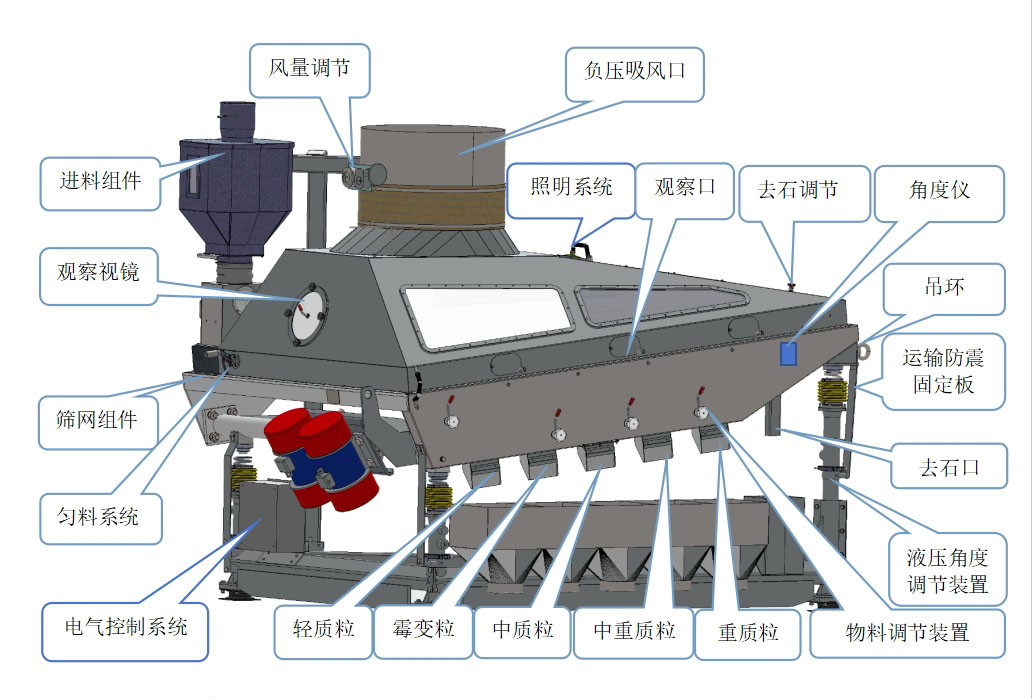 3.出料端設(shè)計(jì)六級(jí)比重不同的物料出口,可有效分離出石子、重質(zhì)粒、中重質(zhì)粒、中質(zhì)粒、霉變粒、輕質(zhì)粒。
